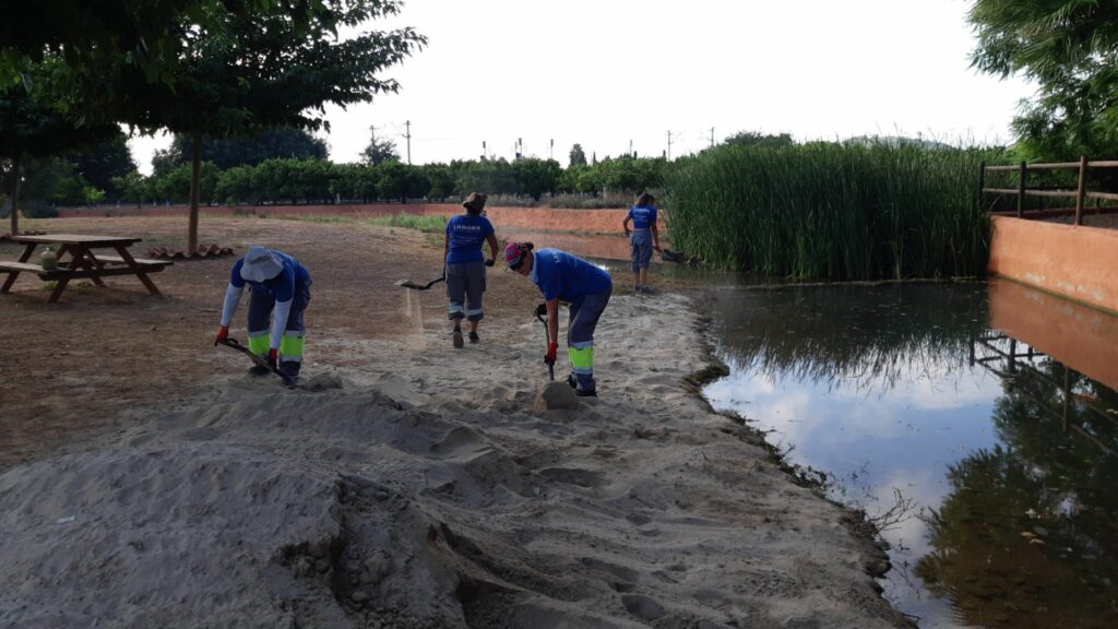 Els alumnes del taller de jardineria creen una “platja” amb l’arena de les festes en la Llosa