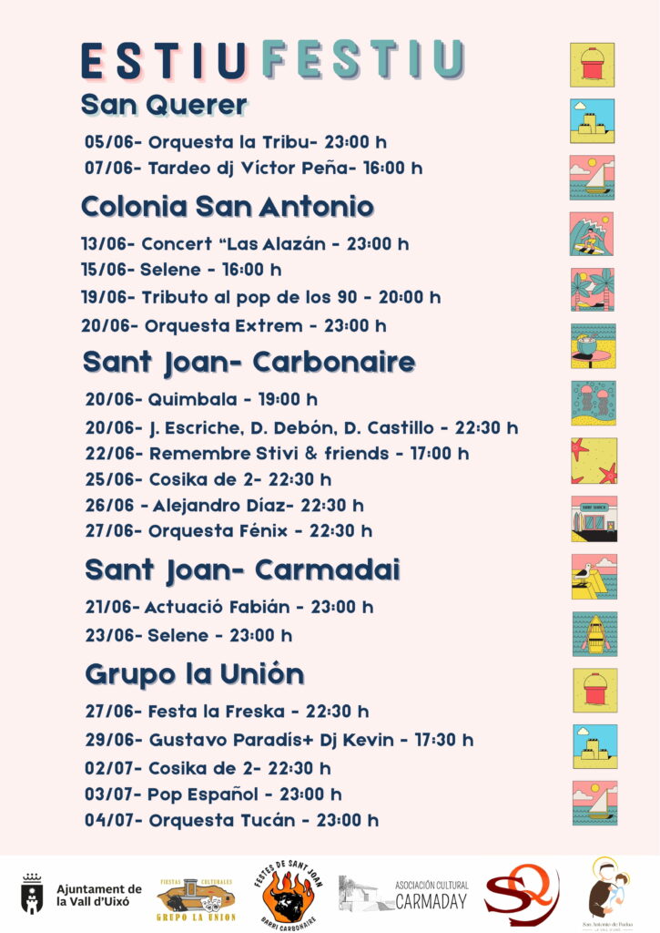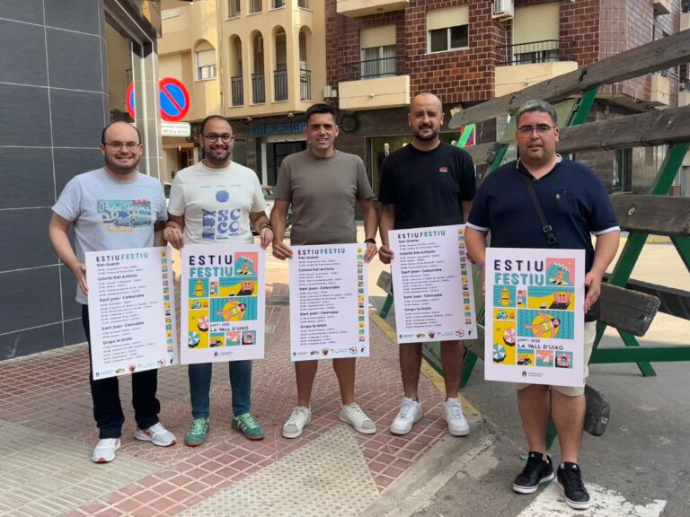 Estiu Festiu és el projecte que dóna a conèixer la programació musical de les festes de barri de la Vall d’Uixó. Aquesta iniciativa de la Regidoria de Festes de l’Ajuntament de la Vall d’Uixó compta amb el suport de les comissions, que s’han implicat “per donar protagonisme a les festes de barri i potenciar-ne la programació”, ha valorat.