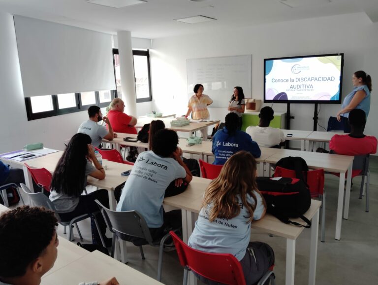 L’alumnat treballador de l’Escola Taller de Nules segueix avançant en el seu programa de formació amb la participació en diferents xerrades i tallers. Recentment, els i les alumnes han assistit a una sessió impartida per l’Associació de Famílies i Persones Sordes de la província de Castelló (ASPAS), en la qual han pogut conéixer de prop la realitat de la discapacitat auditiva.