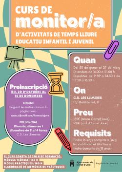 El curs consta de 310 hores de formació, de les quals 150 són teòriques i 160 corresponen a pràctiques i a la memòria de pràctiques. Es desenvoluparà del 30 de gener al 27 de març, els divendres de 16.00 a 21.00 hores i els dissabtes de 9.30 a 14.30 i de 15.30 a 18.30 hores. El preu és de 185 euros per a les persones que no disposen del Carnet Jove i de 160 euros per a qui sí que el té.