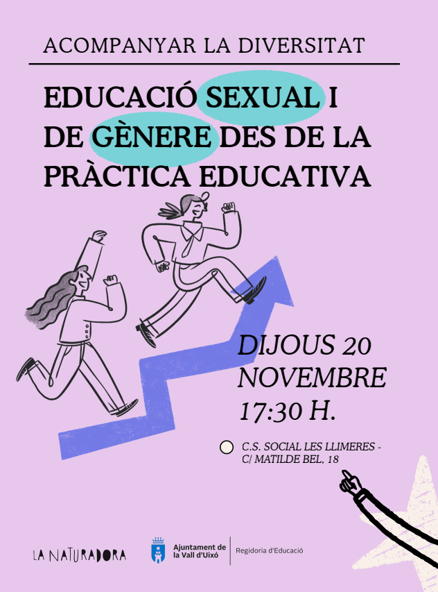 L’Ajuntament de la Vall d’Uixó, a través de la Regidoria d’Educació, ha organitzat el taller ‘Acompanyar la diversitat. Educació sexual i de gènere des de la pràctica educativa’, que tindrà lloc el dijous 20 de novembre a les 17.30 hores al Centre Social Les Llimeres (carrer Matilde Bel, 18).