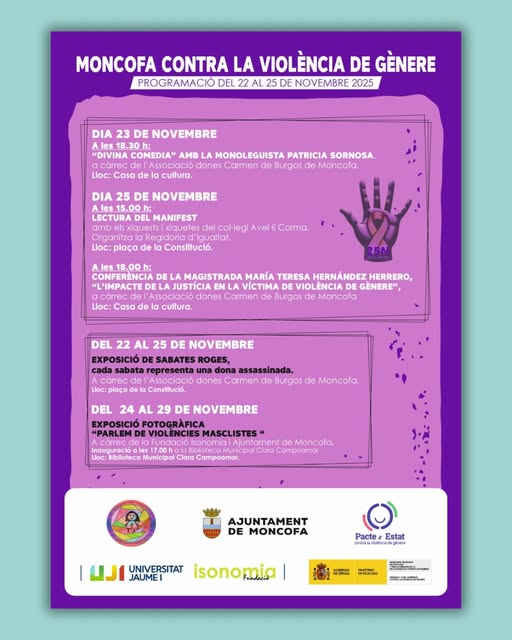 L’Ajuntament de Moncofa ha dut a terme la programació pel 25 N amb l’ajuda i col·laboració decisiva de l’Associació de Dones Carmen de Burgos de Moncofa i la Fundació Isonomia de la Universitat Jaume I de Castelló.