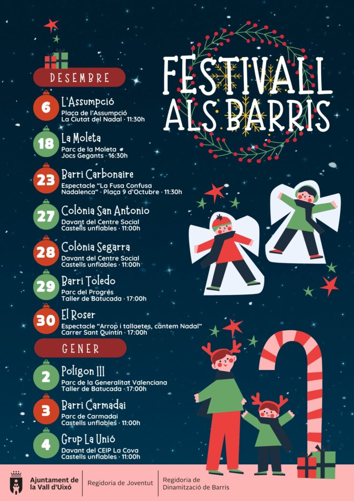 Des de les regidories de Joventut i Dinamització de Barris han animat “totes les famílies de la Vall a participar en aquest festival nadalenc gratuït, visitant tots els barris per divertir-se i viure l’ambient d’aquestes dates tan especials per als més menuts”. L’horari de cada zona varia segons el dia i pot consultar-se en la cartelleria oficial.
