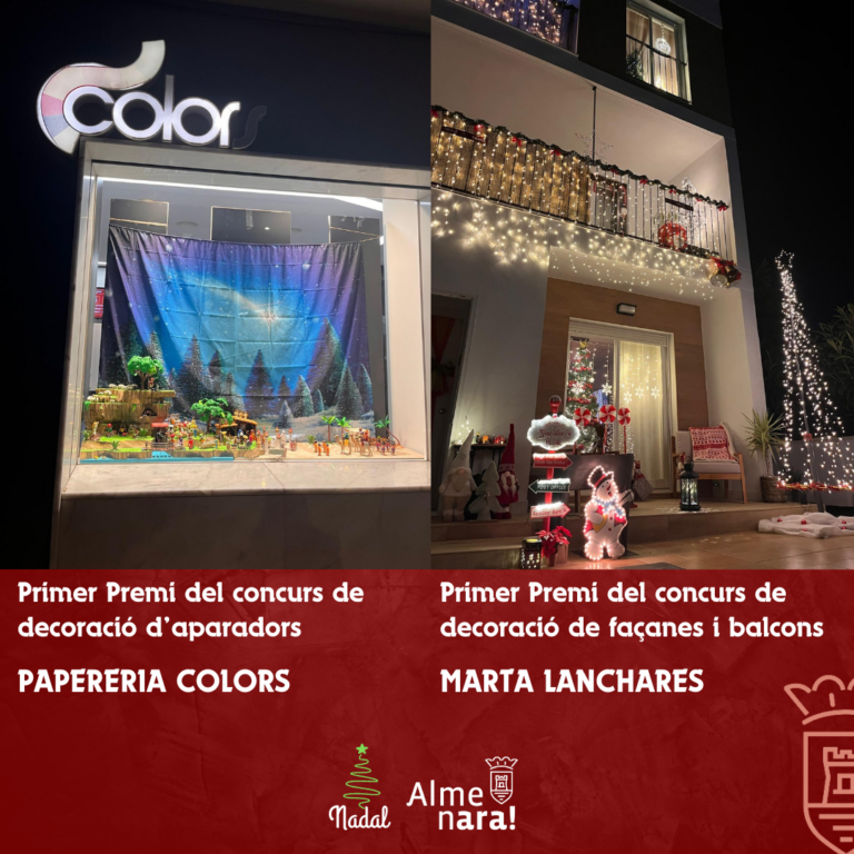 El lliurament de premis de tots dos concursos tindrà lloc el dissabte 3 de gener, a les 18.00 hores, en el CMC Paulo Freire d’Almenara, just abans de la representació del musical Tributo Encantados, a càrrec de Eventime Teatre.Des de l’Ajuntament d’Almenara, es vol agrair la participació de tots els comerços i veïns i veïnes que han contribuït a embellir el municipi durant aquestes dates tan assenyalades, així com felicitar els establiments premiats i persones premiades per la seua creativitat, dedicació i originalitat.
