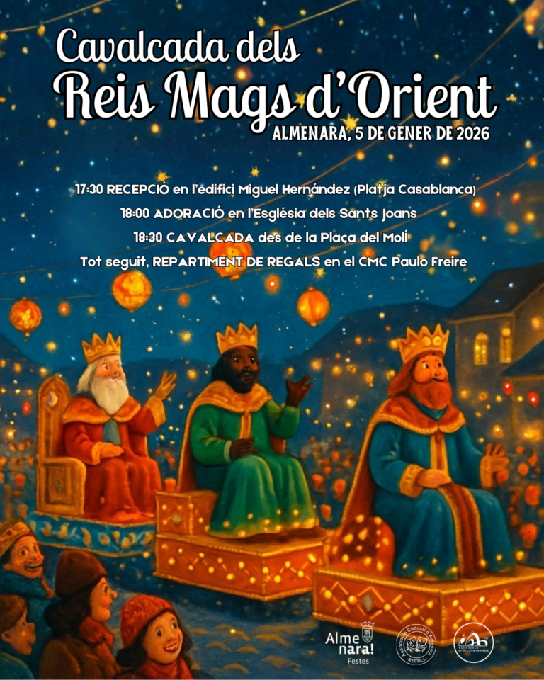 L’Ajuntament d’Almenara està ultimant tots els detalls per a l’arribada dels Reis Mags d’Orient dilluns que ve 5 de gener a la vesprada. La programació inclou la tradicional cavalcada, així com el posterior lliurament de regals als xiquets i xiquetes de la localitat, a més de diverses activitats prèvies.