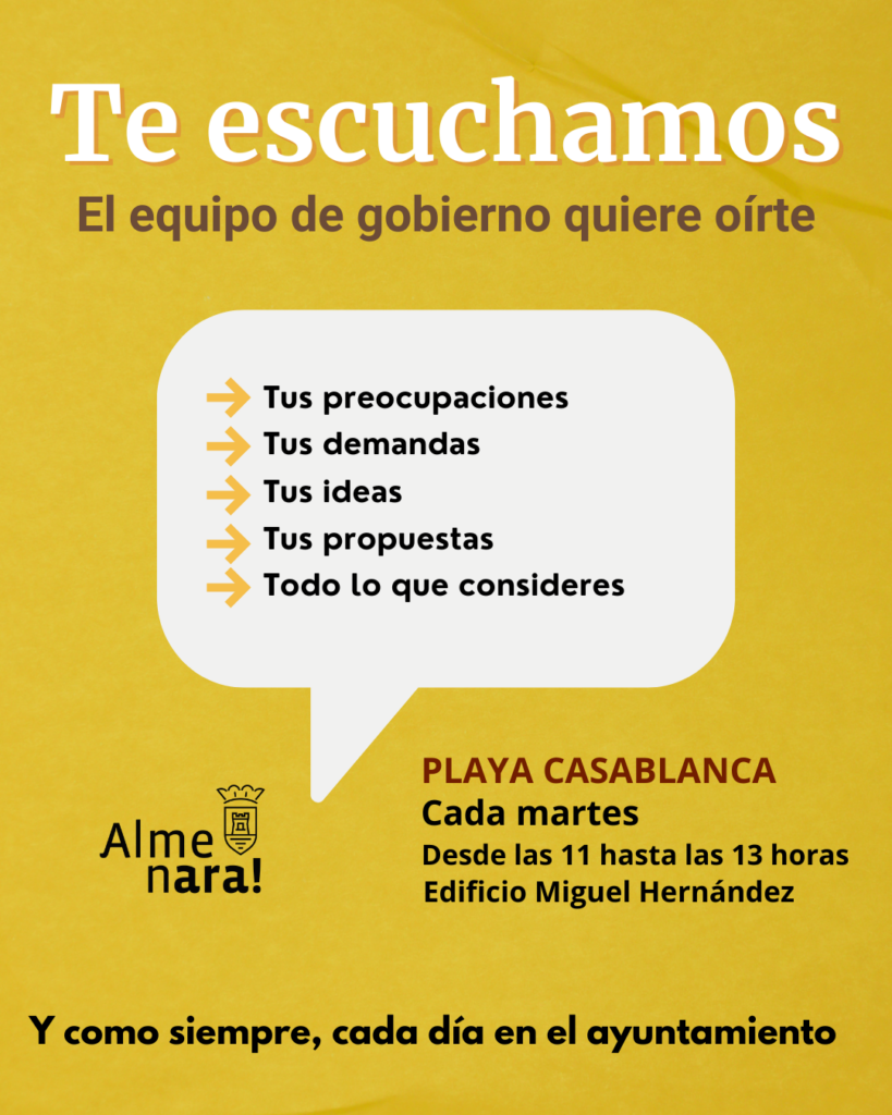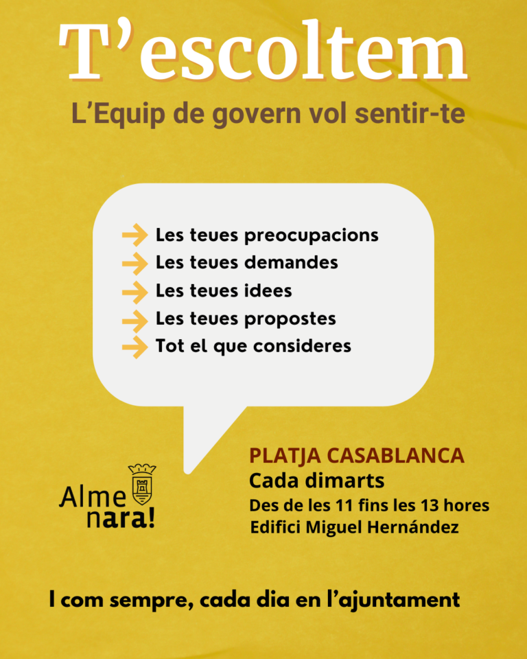 A partir de la setmana vinent, i de forma regular cada dimarts, regidors i regidores de l’equip de govern d’Almenara atendran els veïns i a les veïnes en l’Edifici Miguel Hernández de la Platja Casablanca. Aquesta iniciativa obri una nova via de participació i reforça l’atenció ciutadana en la zona.