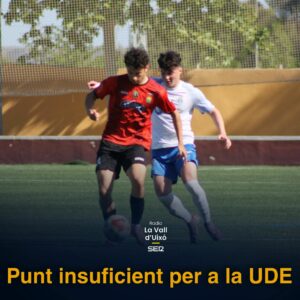 La UDE es va posar el mono de treball i va saber patir per a aguantar el xàfec. El rellotge va anar guanyant dígits i els blanc-i-blaus a mesura que s’anava acostant el final del partit anaven creixent. En l’última jugada del partit –minut 95 i algun segon– Borja Vicent després d’un servei de cantonada va tindre una immillorable acció per a haver pogut anotar l’1-2 i donar-li la volta al marcador, però… el porter del Jove Español va poder fer-se amb l’última pilota del partit.